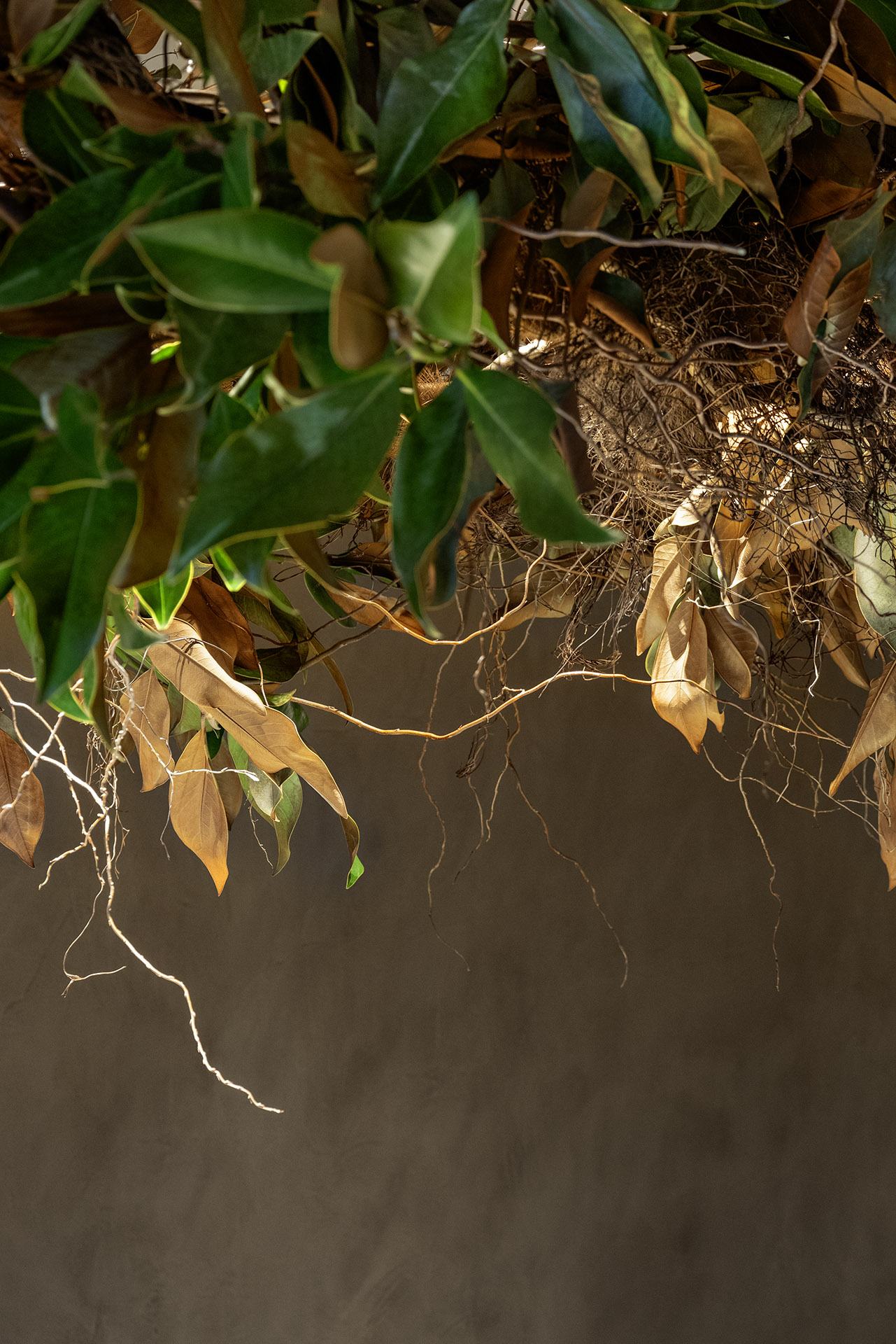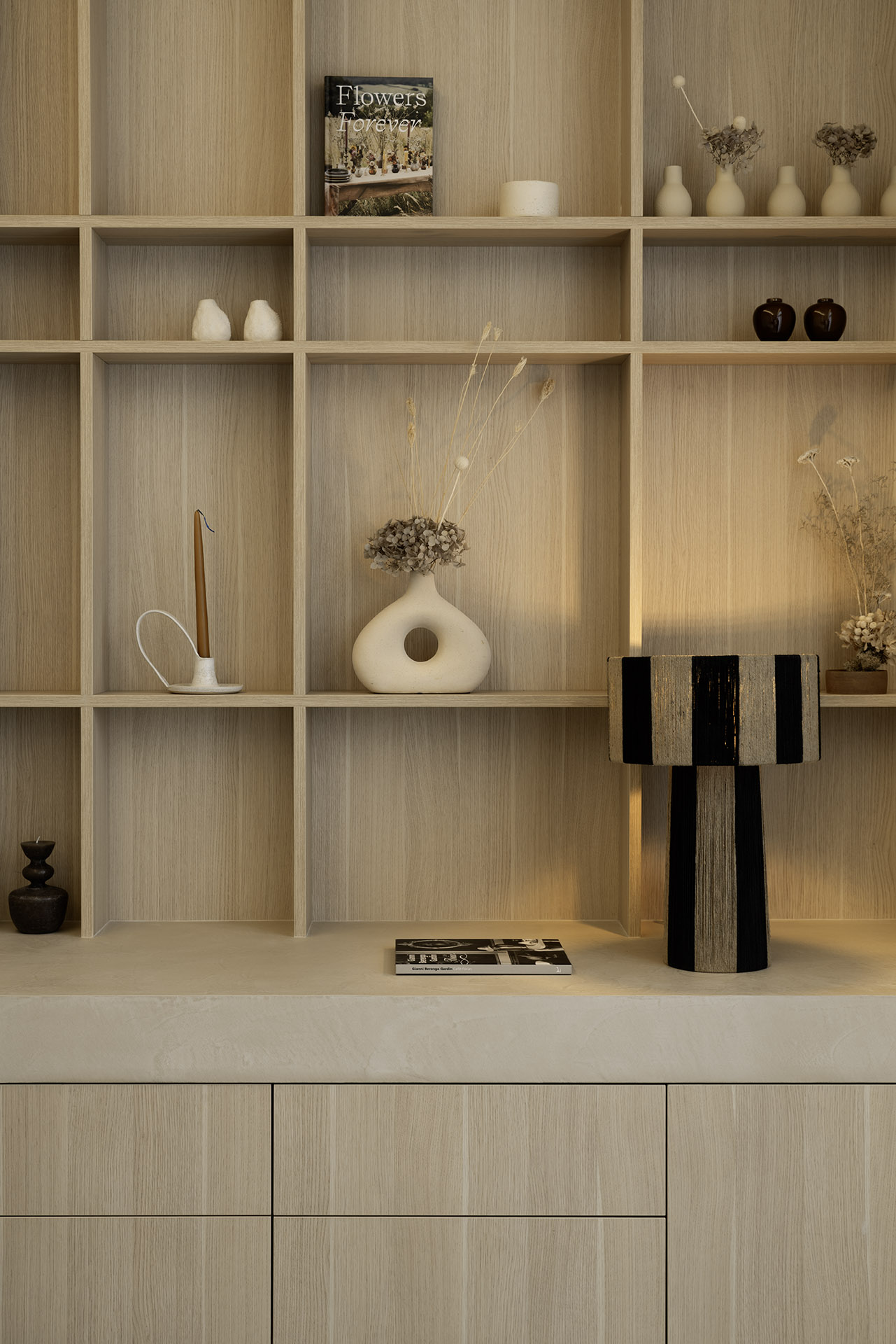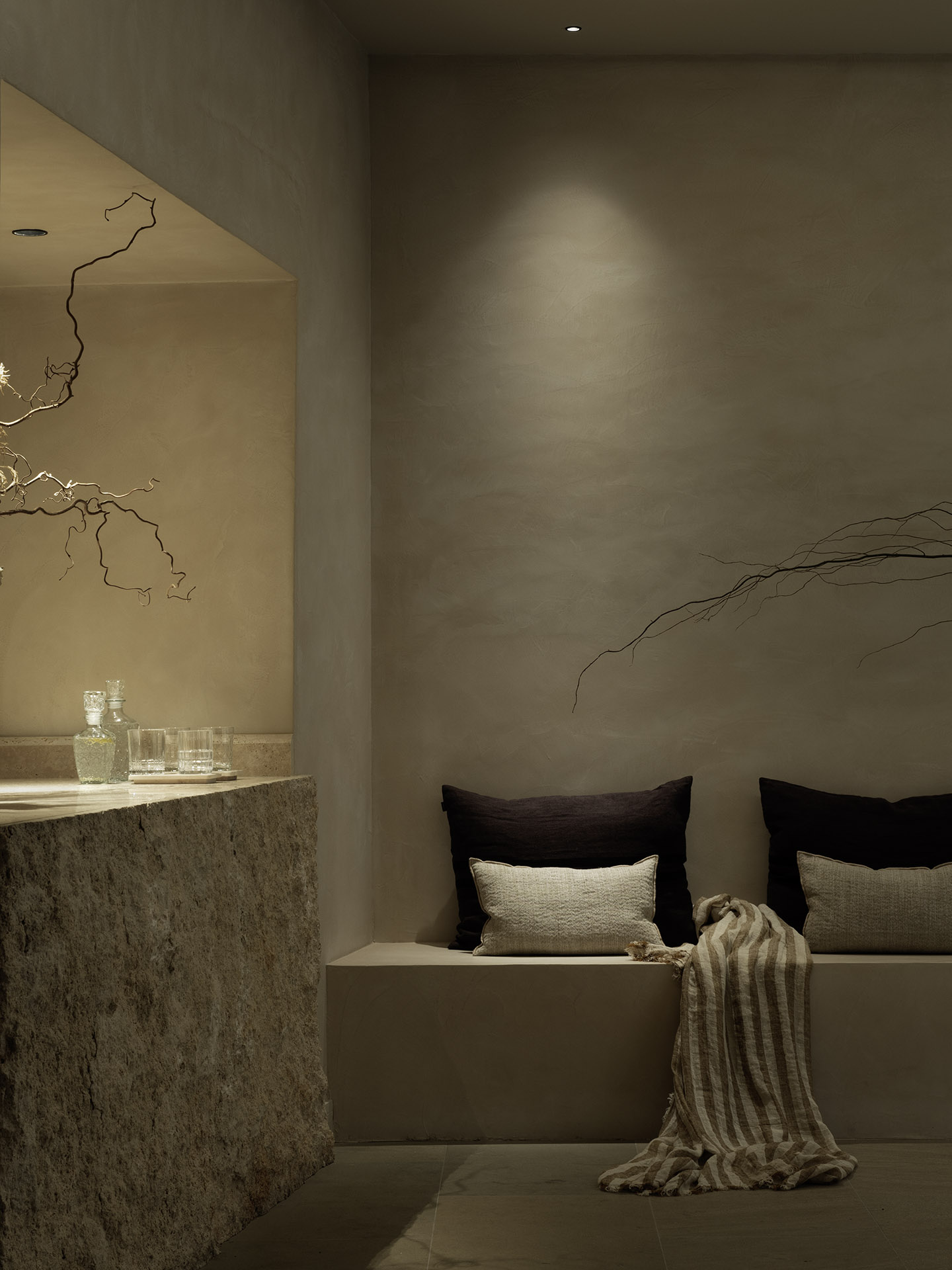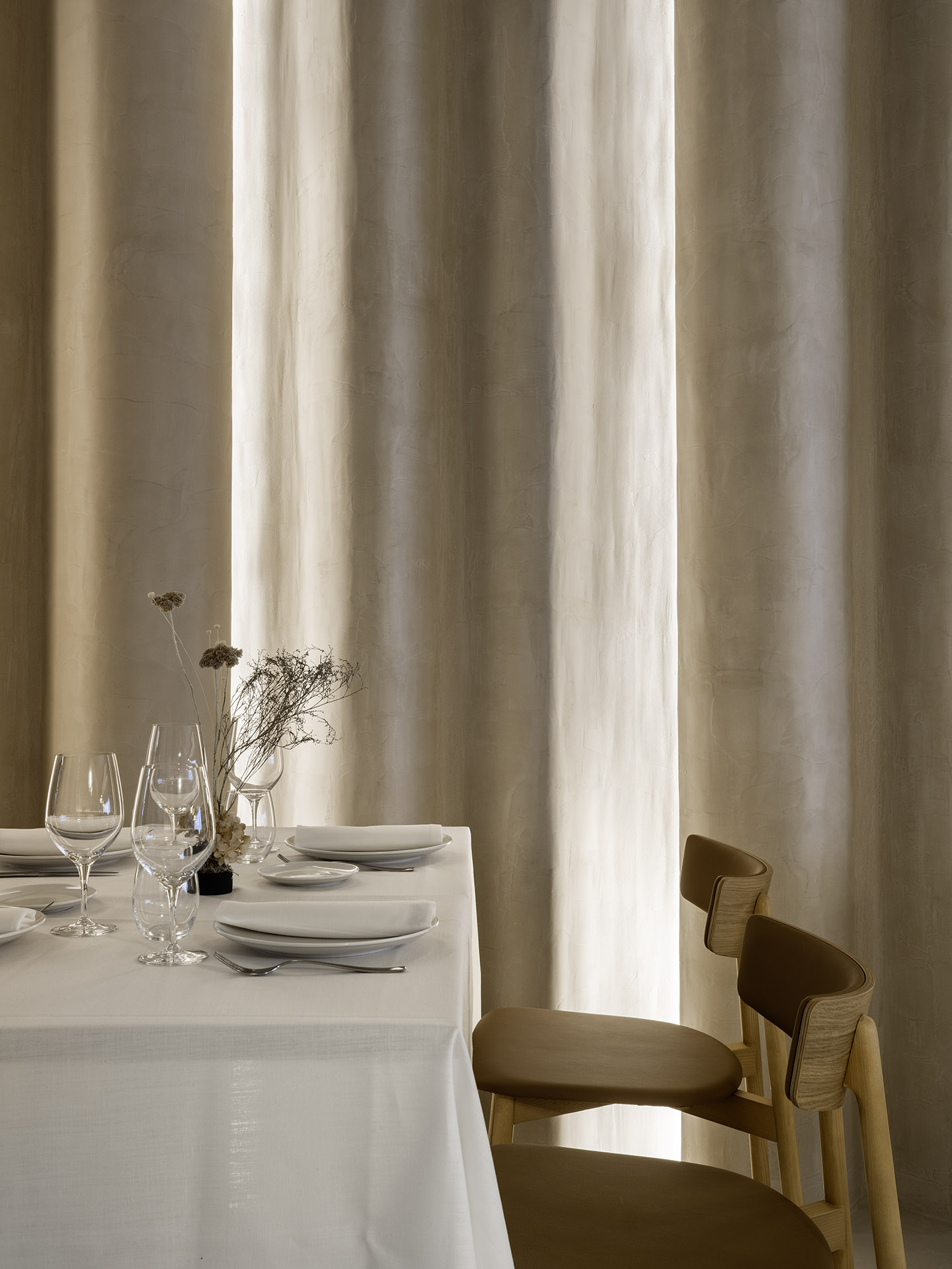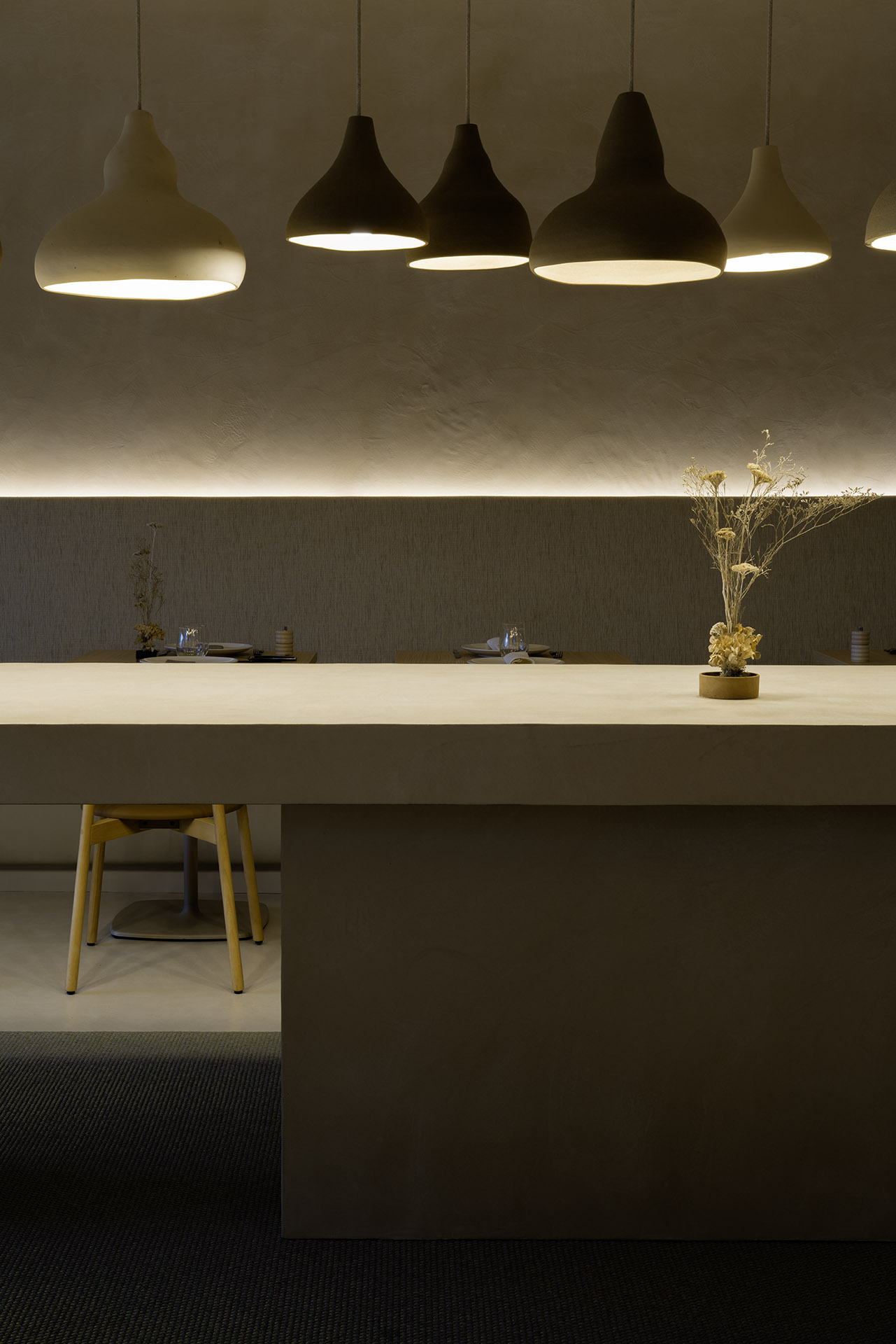 La diseñadora ha creado climas lumínicos en todas las estancias, con luz suave indirecta que va guiando a los huéspedes hacia el silencio y el bienestar. De la misma manera, el proyecto también incluye juegos y guiños a las asimetrías de la naturaleza, especialmente con la disposición de las lámparas de cerámica sobre el mostrador donde se presenta la comida.