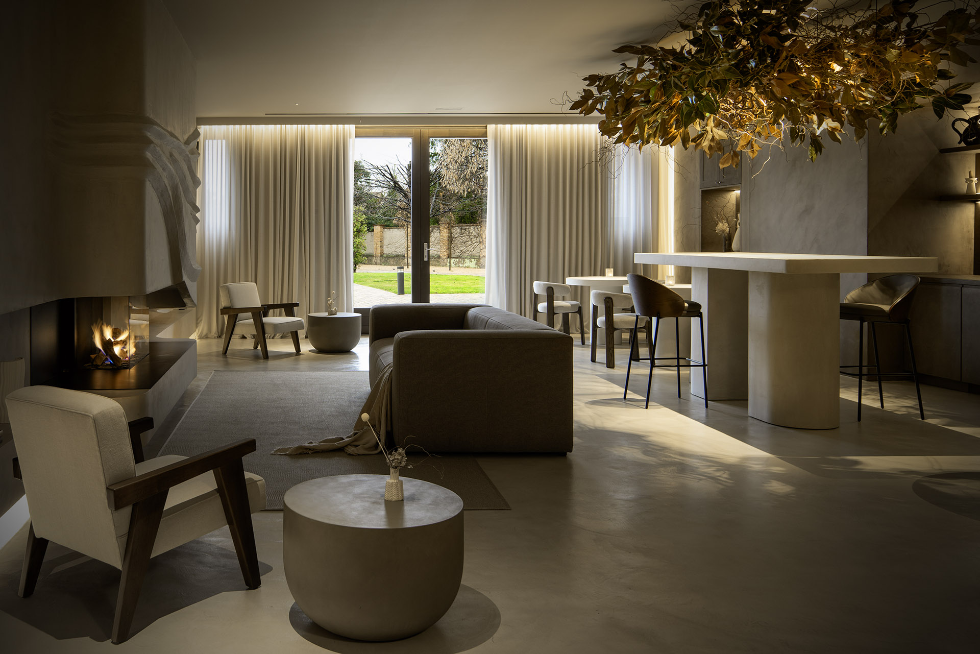 Destaca el mural de olas de arena en la pared, que acompaña la chimenea como si fuera una manta natural captada al momento. Así como también la pared de pequeñas olas en el restaurante. En ambas zonas, la luz natural y la iluminación son clave para crear un ambiente de silencio.