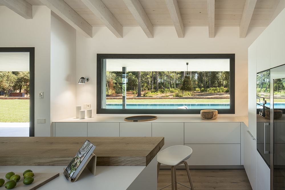 La cocina es unos de los pabellones independientes donde vemos el sello slow de la interiorista catalana a través del juego de las líneas rectas con el techo abuhardillado fabricado con roble decapado en blanco que aporta movimiento y esa sensación eterna de fin de semana. El espacio se conecta con el resto de la casa con unas cristaleras negras que aportan tanta privacidad como complicidad entre los espacios.
