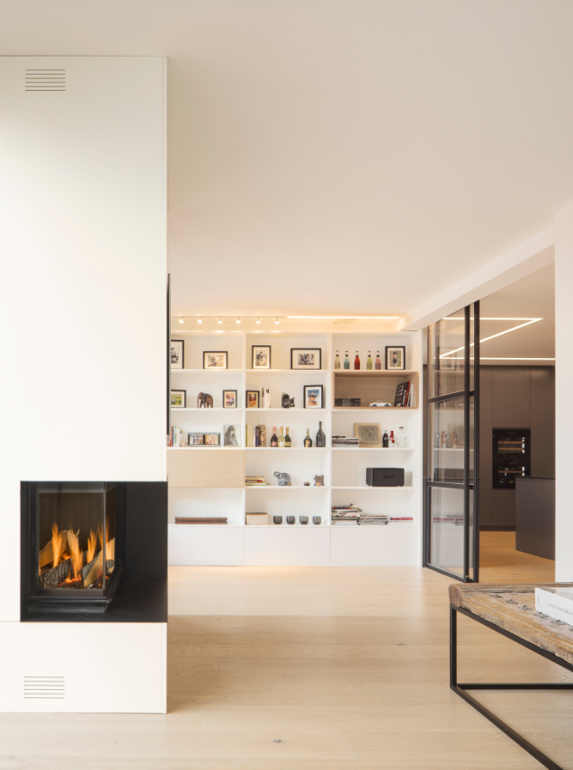 The kitchen is embraced by a skin of white cladding where all the bedrooms are concealed, creating a private and separate ambience between the social area and the most intimate family core.