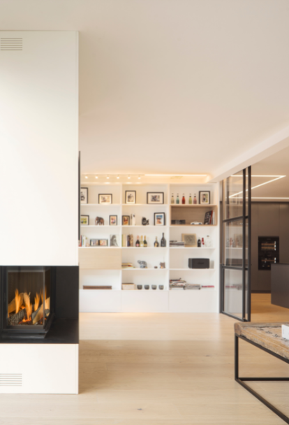 The pièce de résistance is undoubtedly the kitchen, designed to lodge a transparent core of social and family life, is contained in a glass cube.