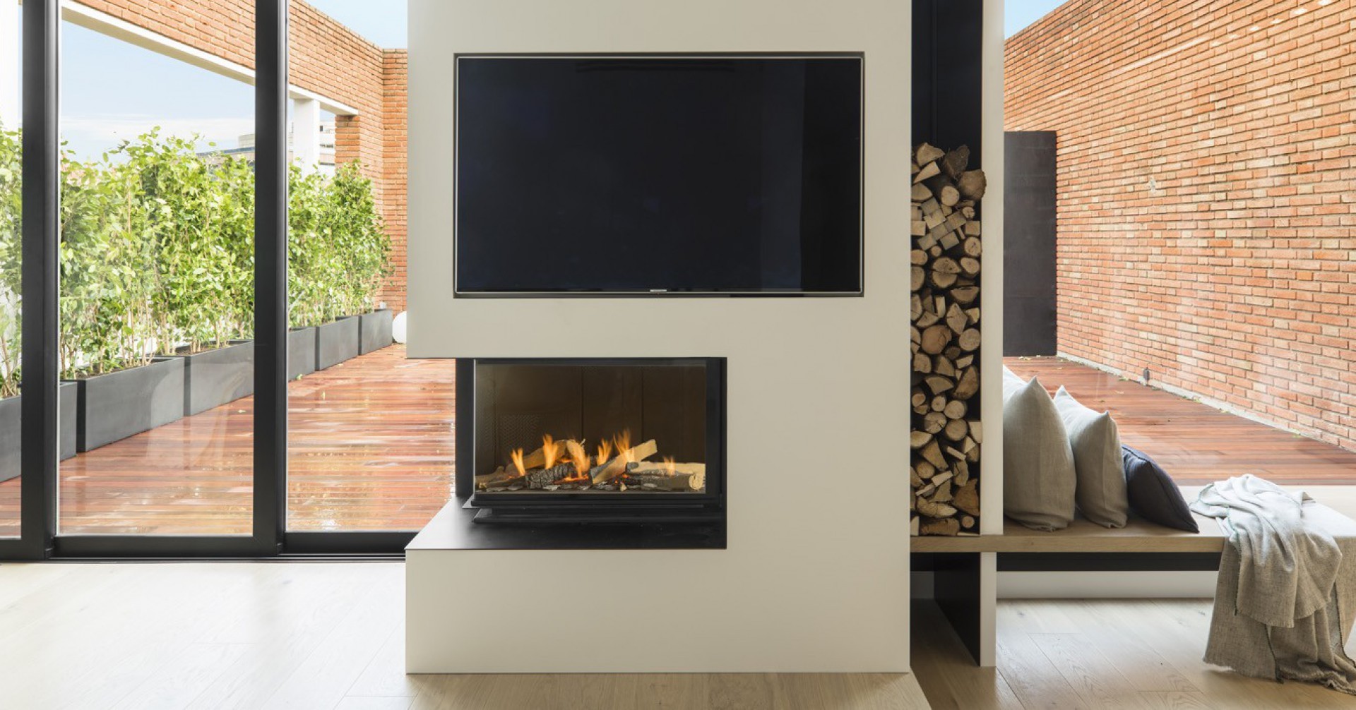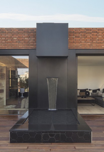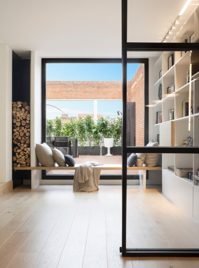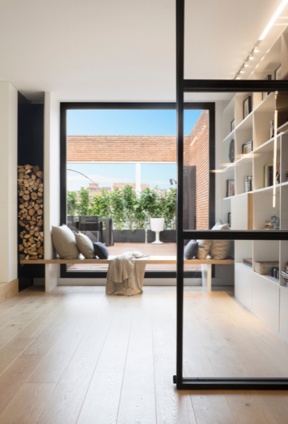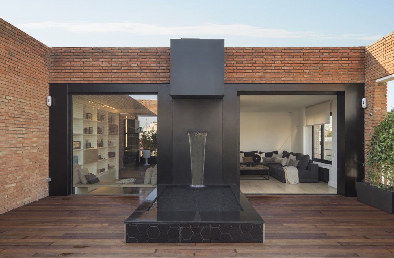 The terrace is designed as the second great social core. It melts into the exterior thanks to the enormous opening that lets the light flood in to accentuate the contrast between the white interior and the metallic blaatio.