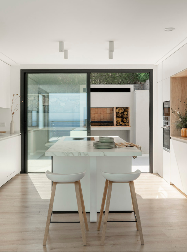 The furniture, in white tones, accentuates the natural light and provides a sense of calm and order. The kitchen incorporates a functional and sophisticated central island, connected to an outdoor barbecue area to enjoy gastronomic moments with the family, always under the Mediterranean sun.