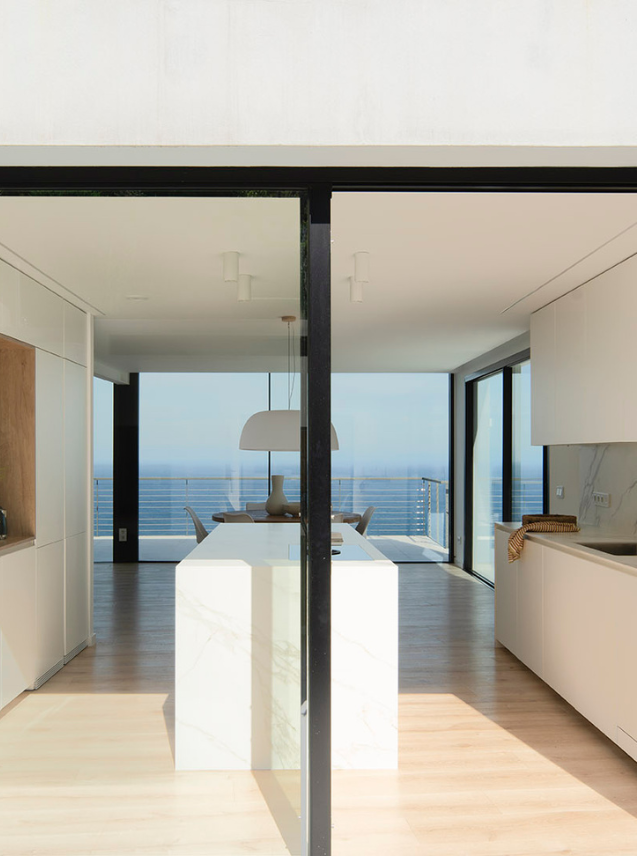 The kitchen and the living room share the same space without visual or physical barriers, extending the horizon towards the sea from any point.