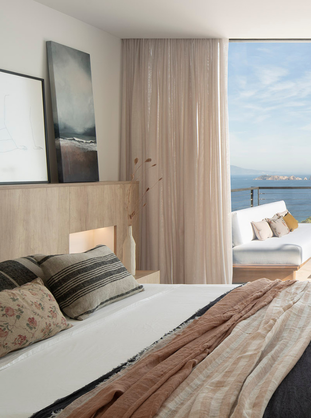 The headboards of the bedrooms, in natural wood, have a groove that acts as a bedside table, a handcrafted and practical detail. Each element is designed to minimise maintenance and maximise well-being, creating a perfect balance between beauty and functionality.