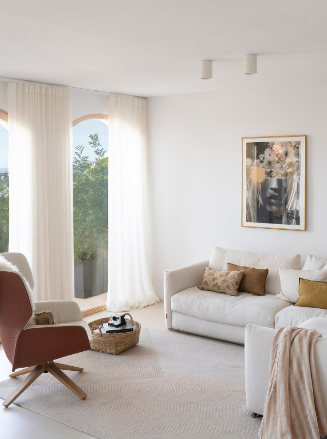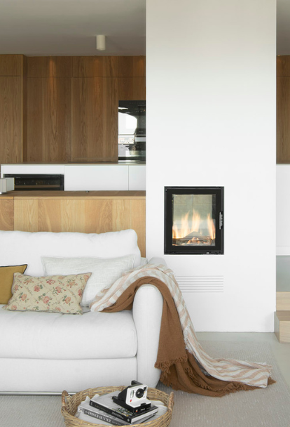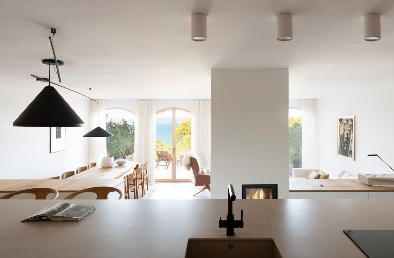 The element that gives cohesion, calm and connection is a double-sided fireplace, integrated into an existing column, which virtually connects the kitchen and the living room and which, of course, is also aligned with the sea.