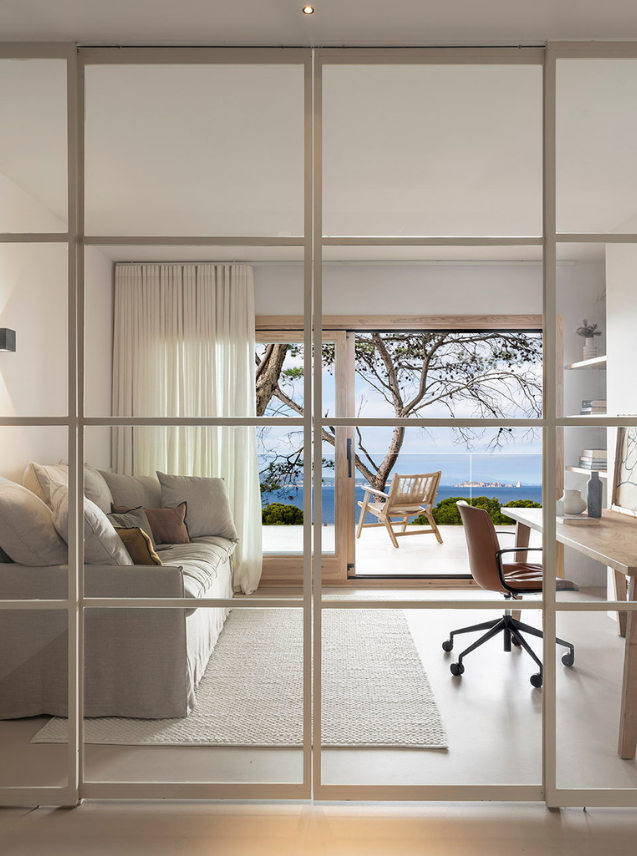 The studio is located on one of the upper floors. An office framed with large aluminium windows that connect directly with the bedroom, giving privacy to work and concentrate, while enjoying the exterior views that it shares with the suite.