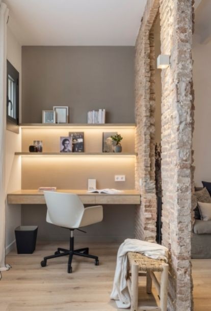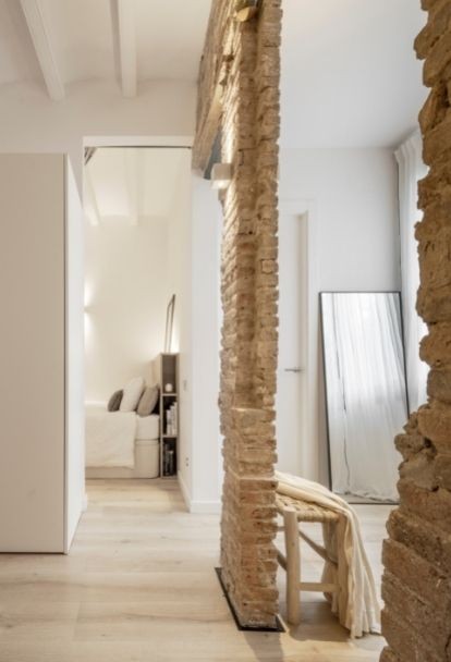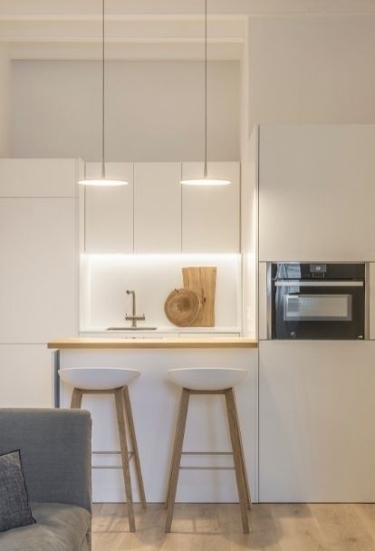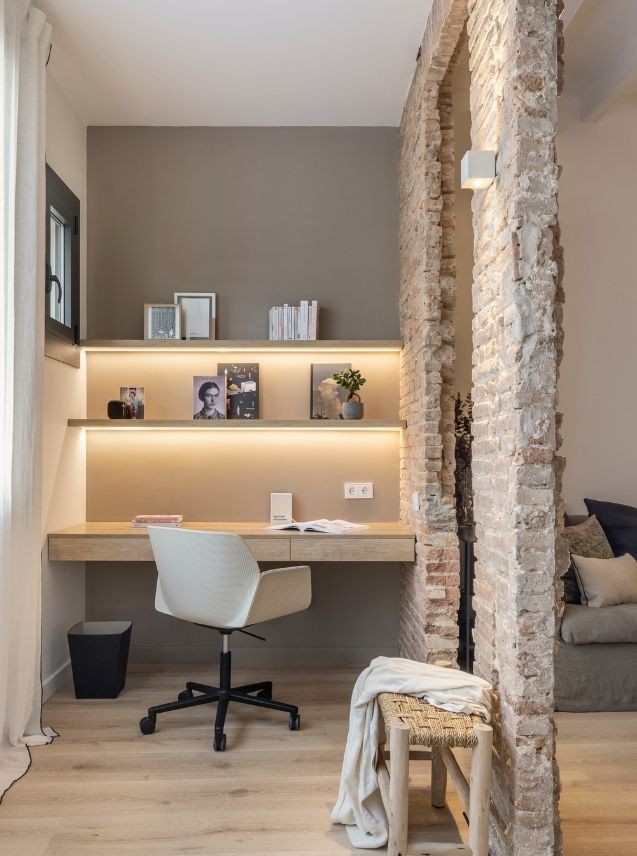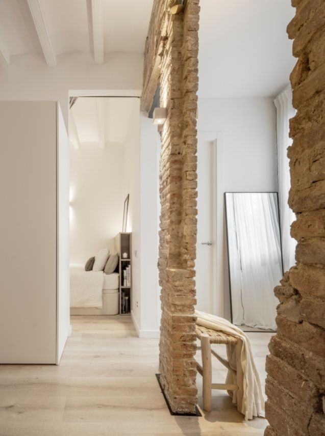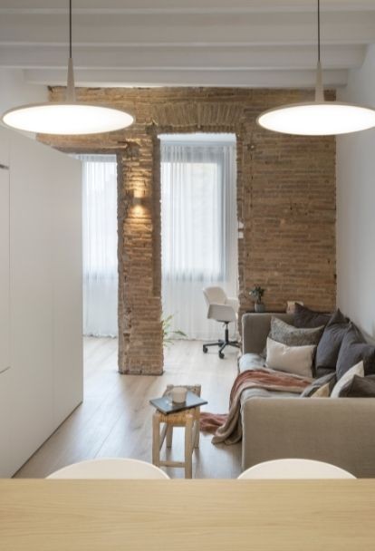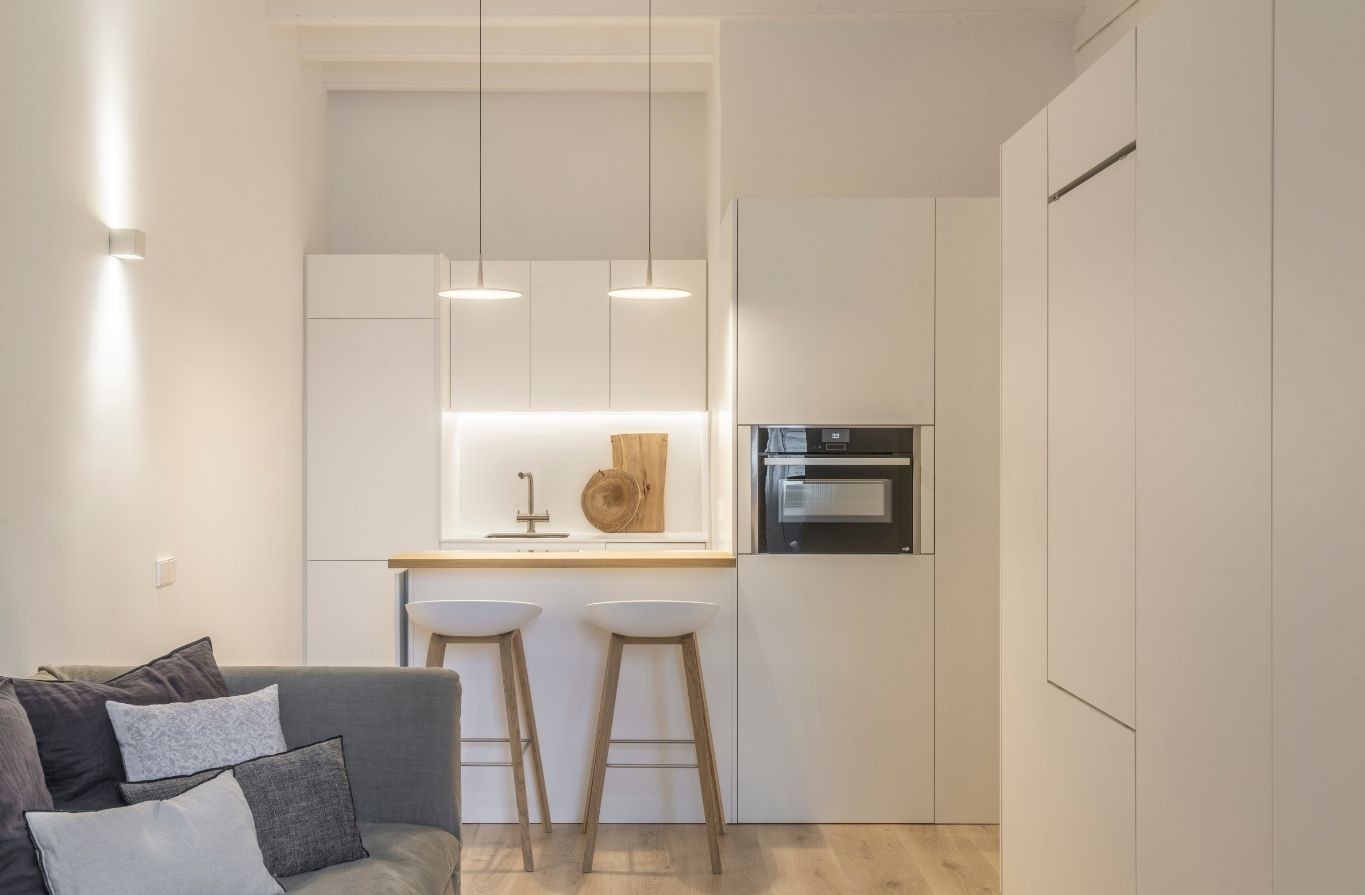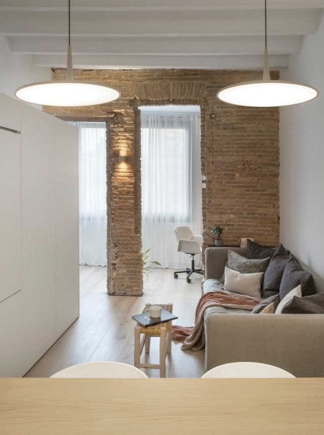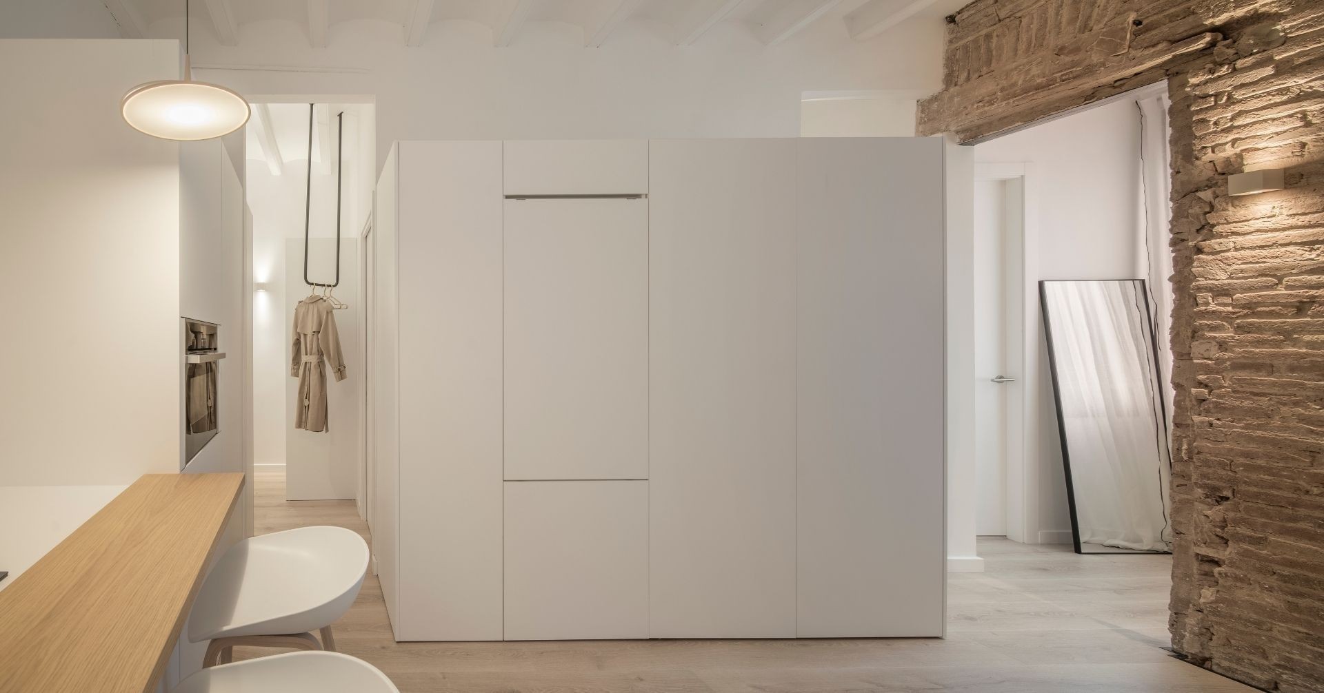 The 50-m2 of this apartment in the heart of the Gràcia neighbourhood, in Barcelona, had uneven walls marked by the character acquired over the passing years, which we were inspired to work on while respecting their structure and the wisdom of time.