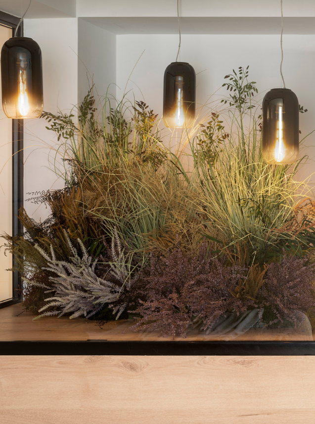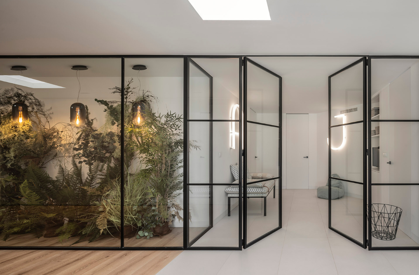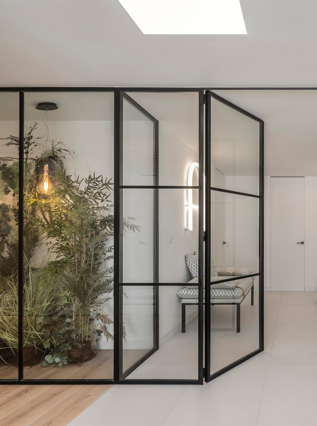 The objective: from the moment we stepped through the door, we wanted to be greeted by this natural light. This was to be accompanied by an intervention of nature framed as a glass greenhouse capsule that runs through the entire hall. Meanwhile, the other side would be dedicated to a large space for cupboards.