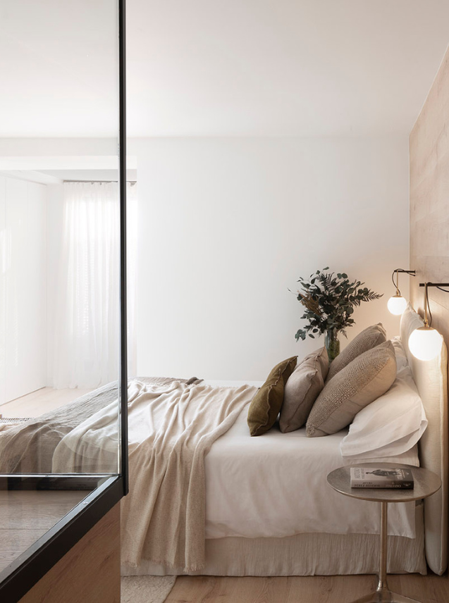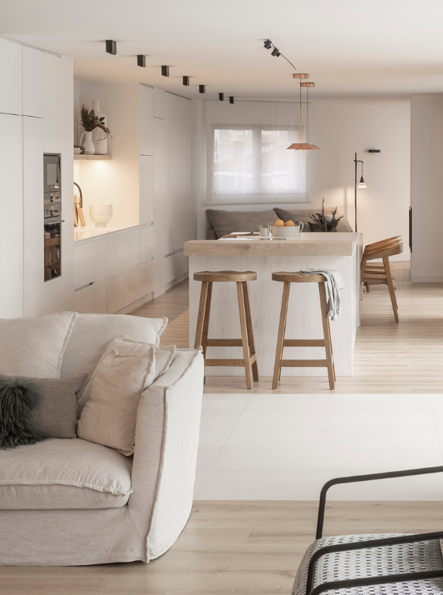 From all corners of the open space created by the kitchen, the living room and the small office, the daylight can be seen, evolving with all its nuances, through each room.