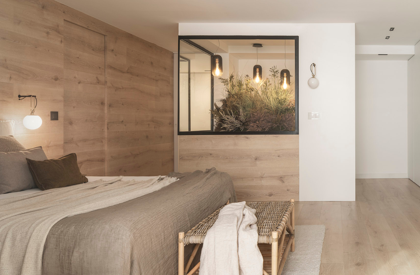 The dialogue with this noble element continues through the night time spaces, being used as the element which defines the main bedroom.