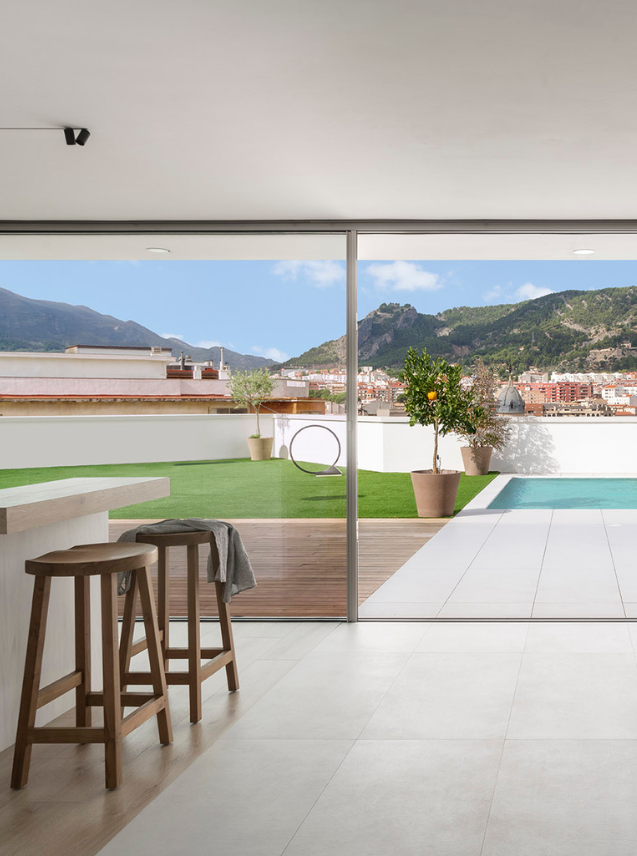 The entire interior-exterior connection allows you to enjoy the same rooms in symmetry according to each season of the year. In winter we are accompanied by the heat coming from the fireplace in the small living room. In summer we can enjoy the pool that occupies a central place on the terrace, a large area which is almost identical to the day area.