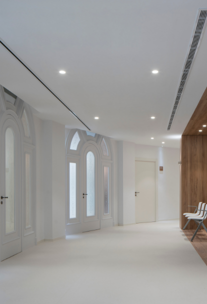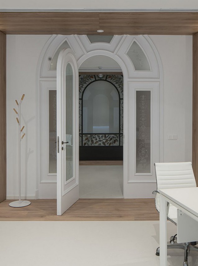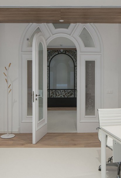 The consulting rooms are enclaves where we find the ancient presence that produces a fusion of past and present. The savoir faire of the modernist era is represented with antique details and the original glass doors, all treated with affection and respect.
