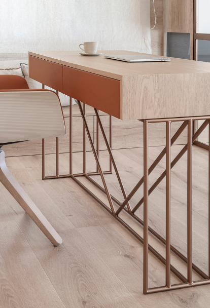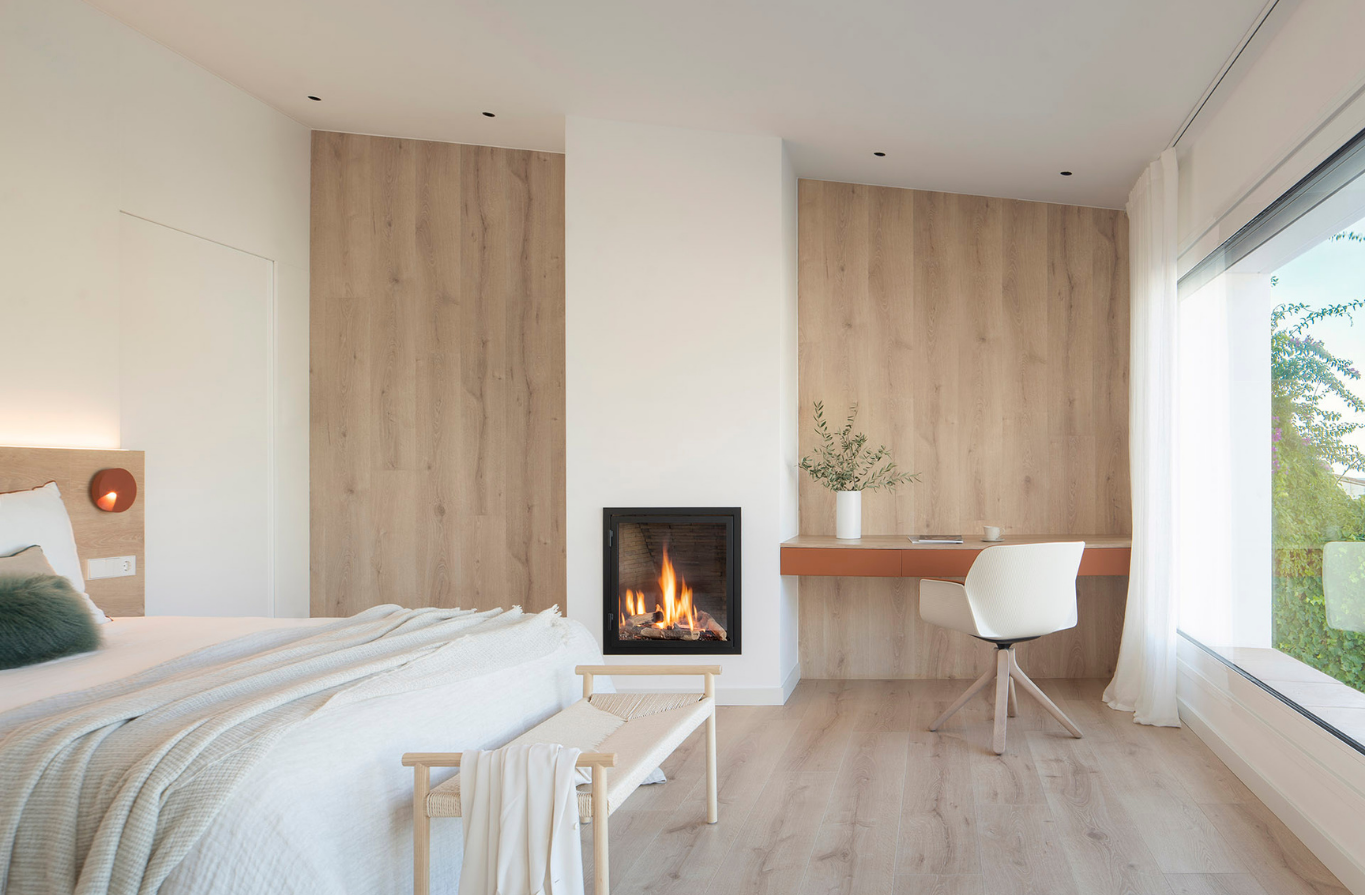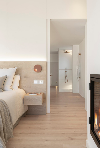 We save the integrity of the oak for the rooms on the upper floor. Two full suites where we achieve a warm embrace in the large bedroom thanks to the covered walls that contain a fireplace and a small desk, with the same copper details as the office on the ground floor.