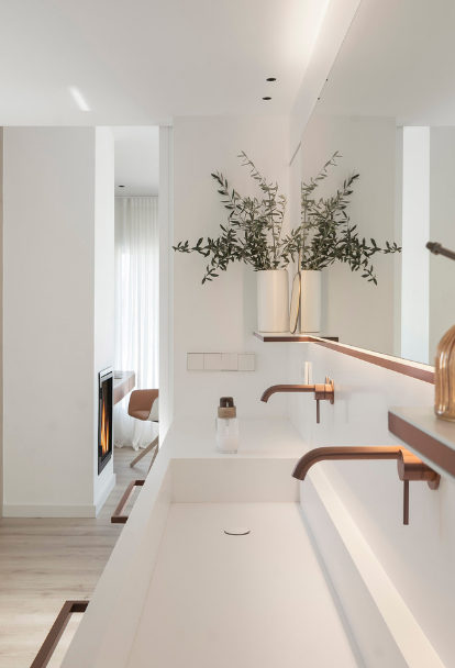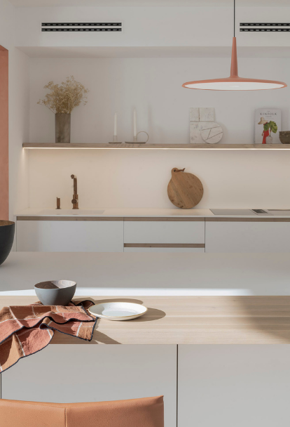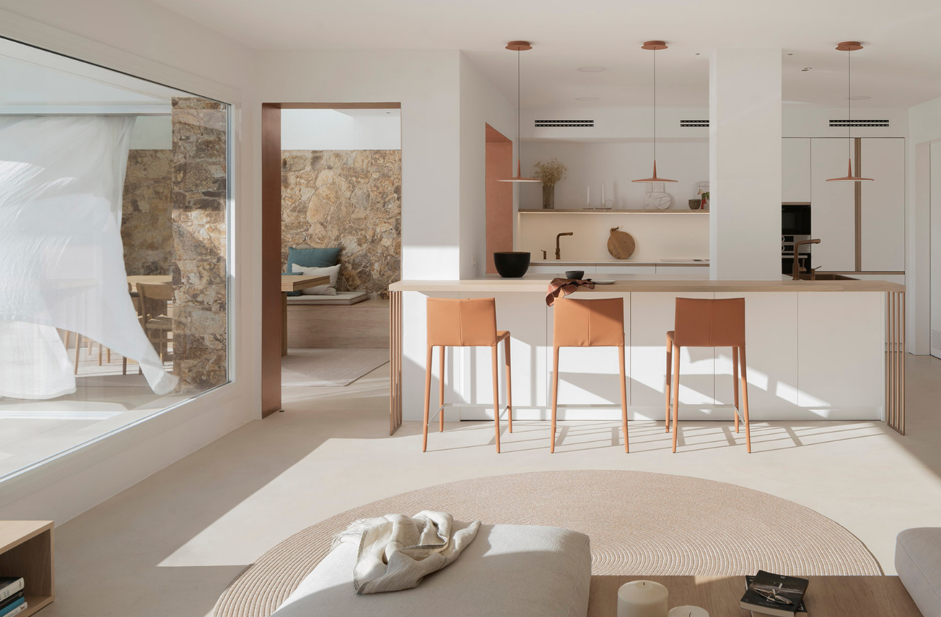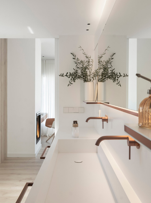 White – our studio's hallmark – brings silence to the dialogue established between the different shades that we find in the details, in the copper tones, the earthy colours and the textures of leather from the furniture that Susanna Cots created exclusively for this home.
