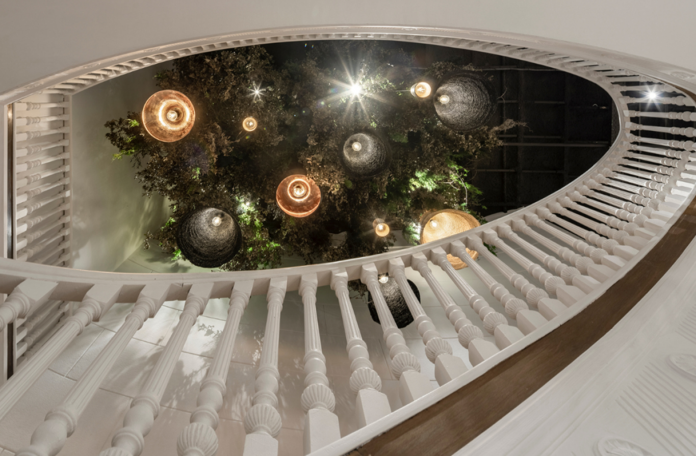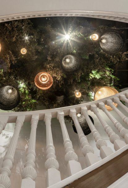 The second plant lung is fully integrated with one of the most emblematic original elements of the store: a 1960s-era staircase that we have maintained and strengthened by creating a plant cloud that houses the brand’s lamps.