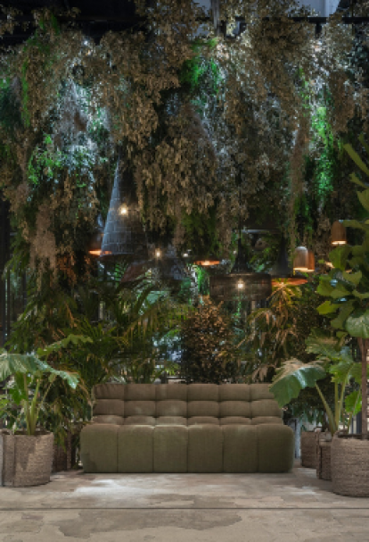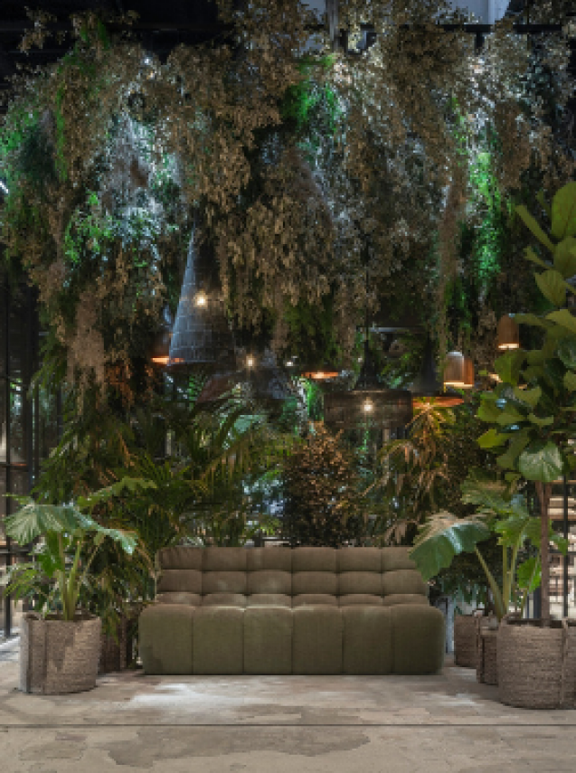 The main lung, a core of vegetation located at the back of the establishment, is framed in a glass and iron cube and seeks to attract our gaze and consolidate the different emotions that we feel at each specific moment of the day.