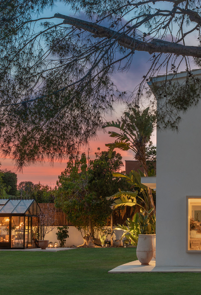 A Nordic-inspired greenhouse is featured in this garden, serving as a meeting point to enjoy time with family and friends.