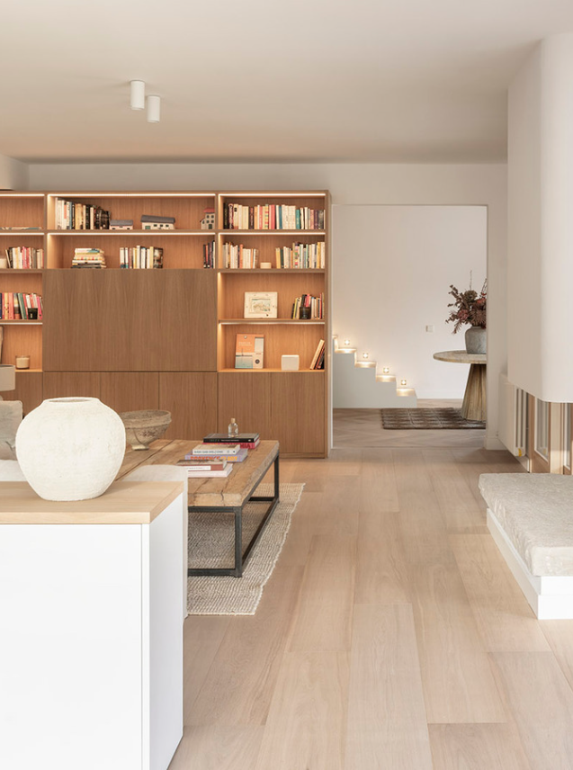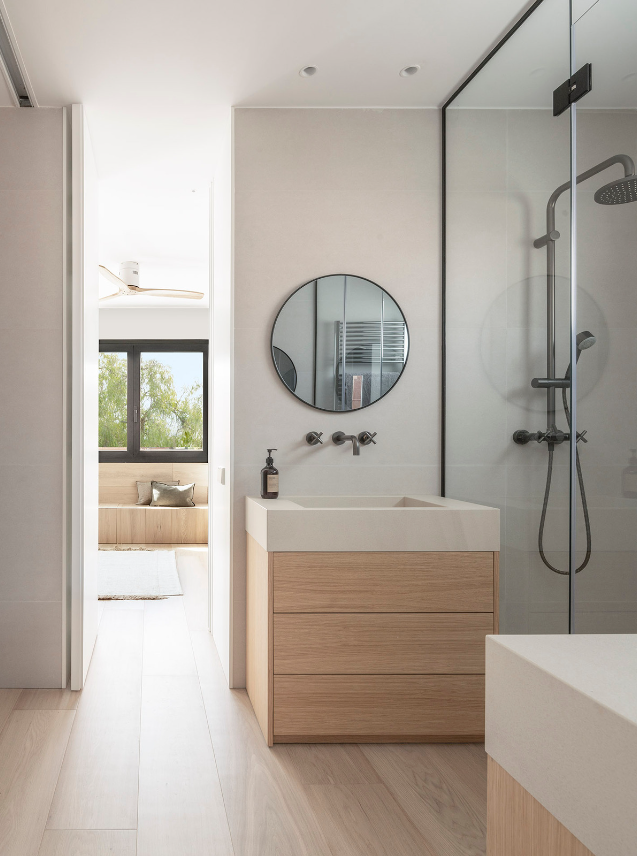 Likewise, two symmetrical suites have been designed that share a fully furnished bathroom and whose doors are integrated into the furniture, being hidden from view of all the rooms. The project also features another suite with a separate bathroom.
