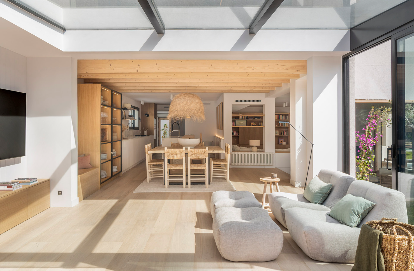 In this project we find it in the living room and the kitchen, where the doors fully open: the porch becomes a dining room and the dining room an extension of the porch. The uniting element is a single chimney projected in a symmetrical way, which we find in both rooms.