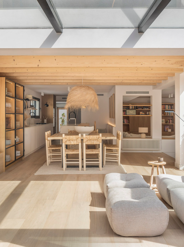 The dining room is undoubtedly the heart of the home and the family. Following the designer’s subtle style of framing prominent areas, the space is crowned by a natural beam ceiling and defined by one of the two cupboards, which mark the identity of the room.