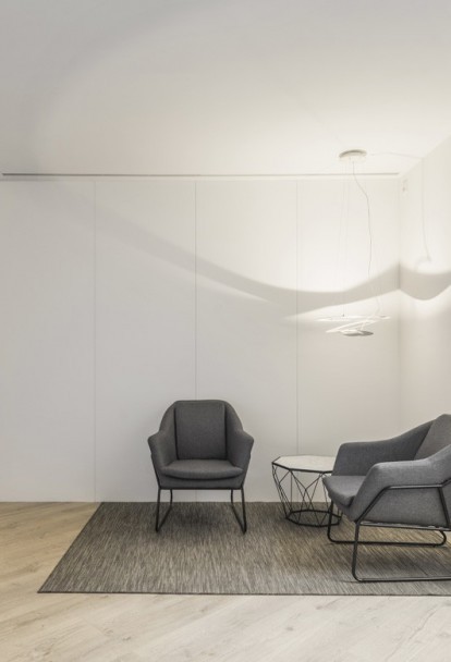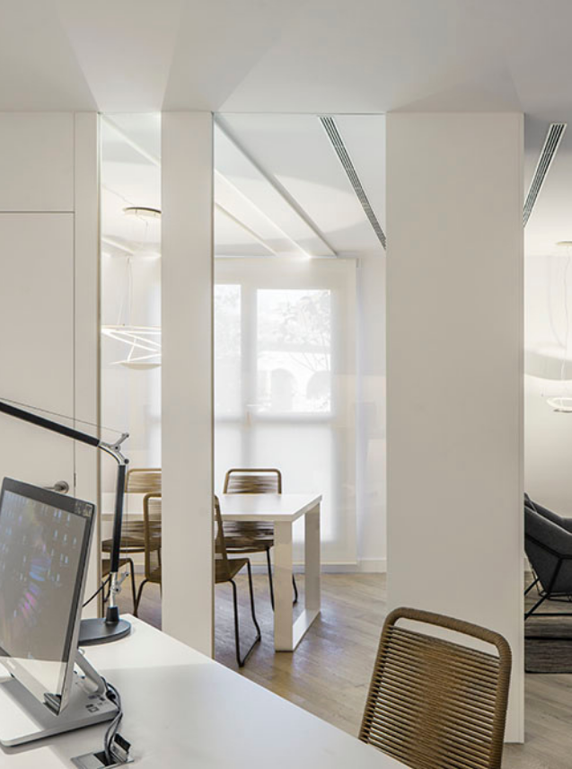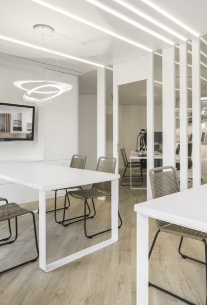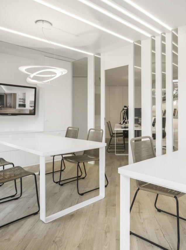 As in all her projects, the study of lighting is crucial and in this instance it is artificial lighting that creates a play of shadows to produce a more responsive working environment enhanced by materials such as wood and use of vegetation, keys to creating a climate of work-oriented wellness.
