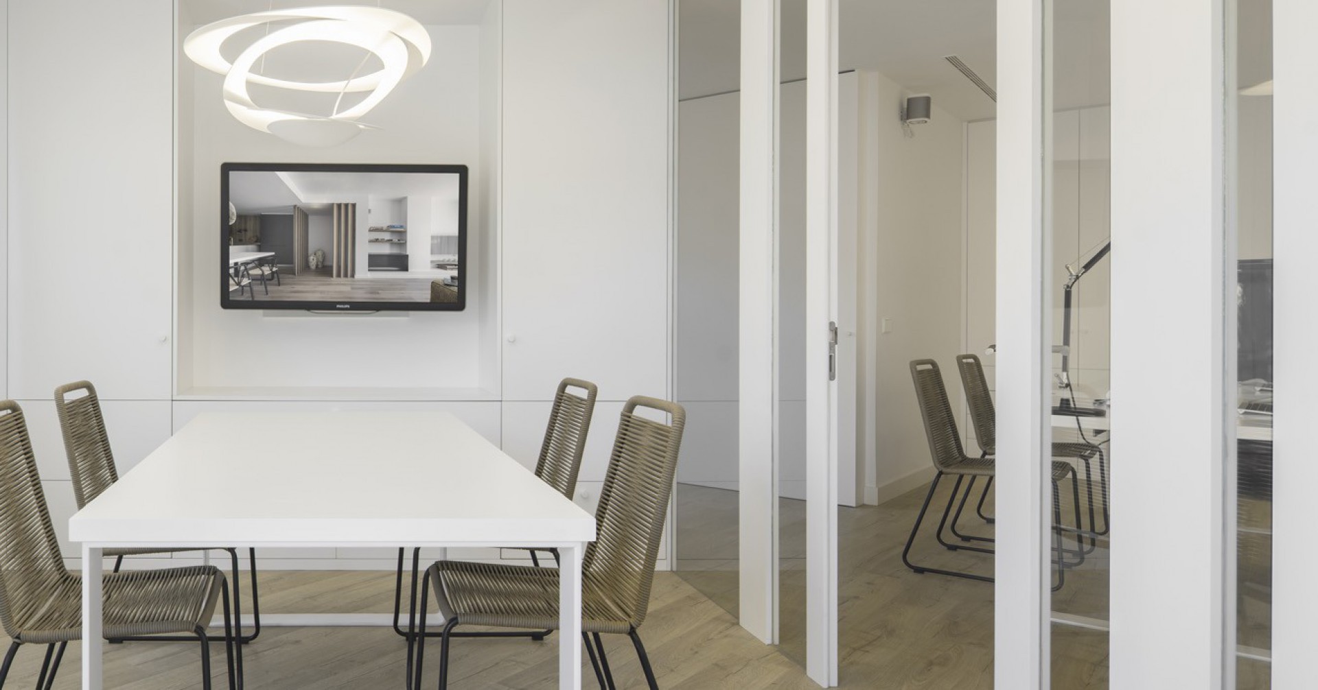 The original distribution places the meeting room, the design of which plays with the interaction of wood and glass, at the centre of the main space, parallel to the façade. In this way the project integrates the exterior with the exterior by extending the outside pergola with the meeting room. It thus provides light in the external work area and maintains the privacy of the meetings.