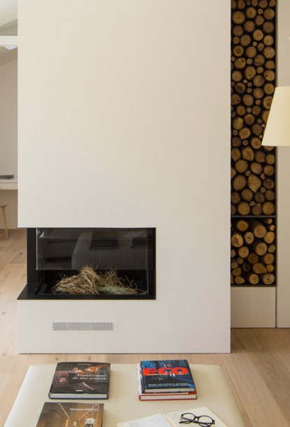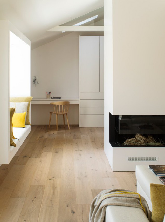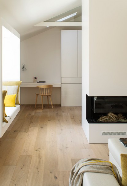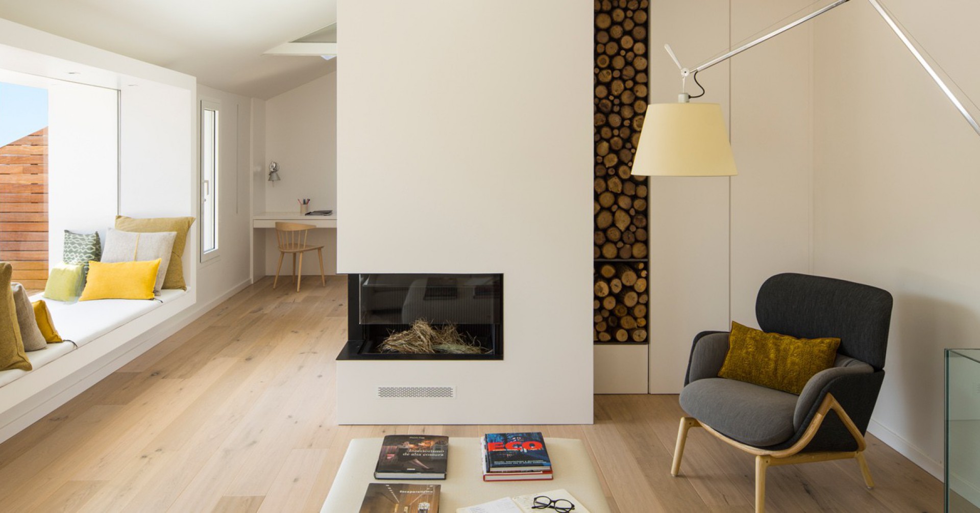 The kitchen plays with interior-exterior symmetries to ensure that the dining table belongs equally to both areas. Moreover, the living room features a central fireplace that contributes a comfort factor while aesthetically enriching both points of view. The ground floor is devoted to two suites, both endowed with full bathrooms.