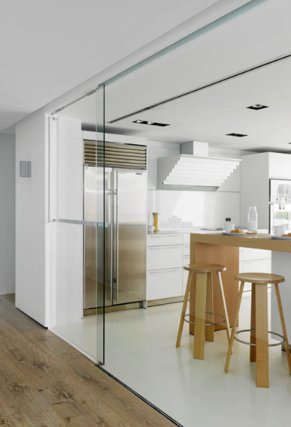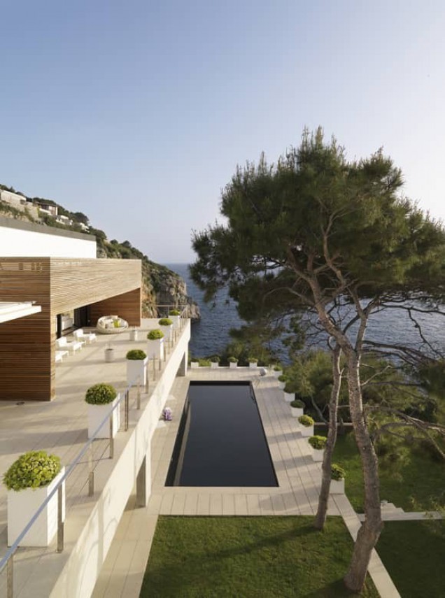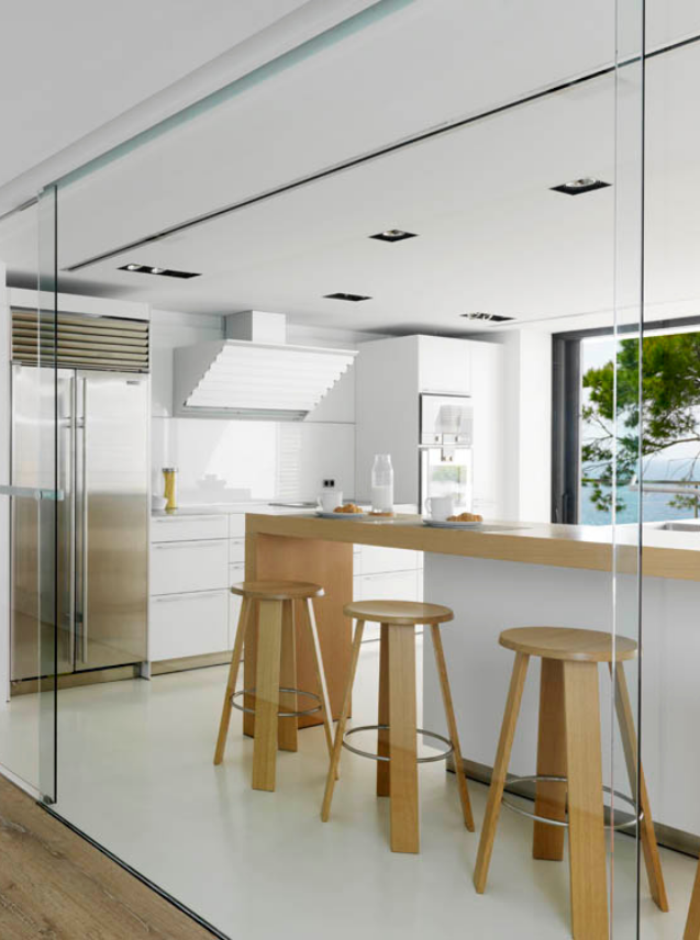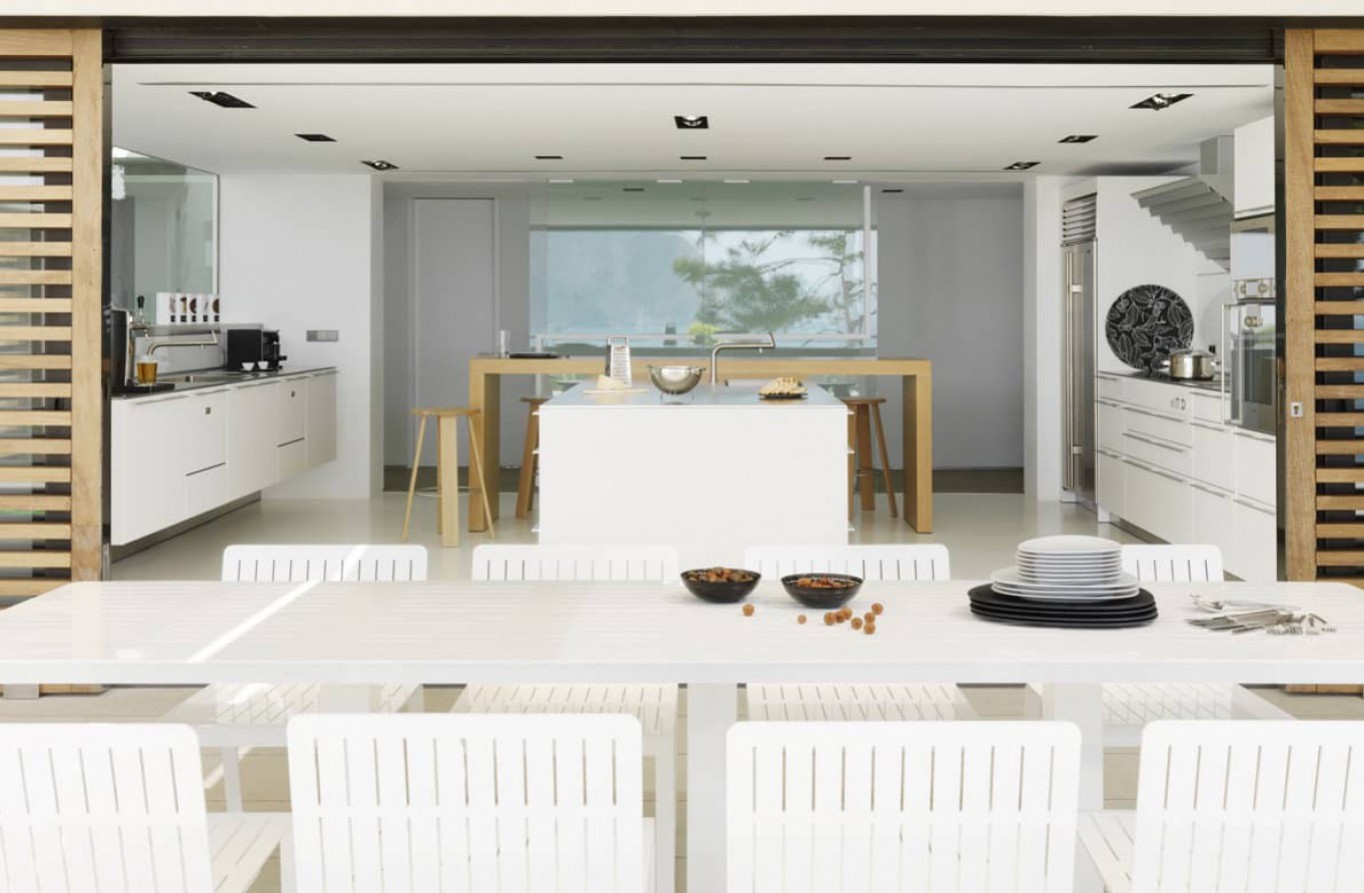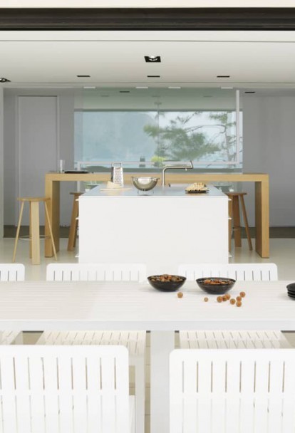 The daytime zone that includes the dining room and living room areas was projected in a way that the exterior seems to spill into the house so when relaxing on the sofa one is invaded by the intense blue of the sea, which embraces the whole living area as well as the kitchen.