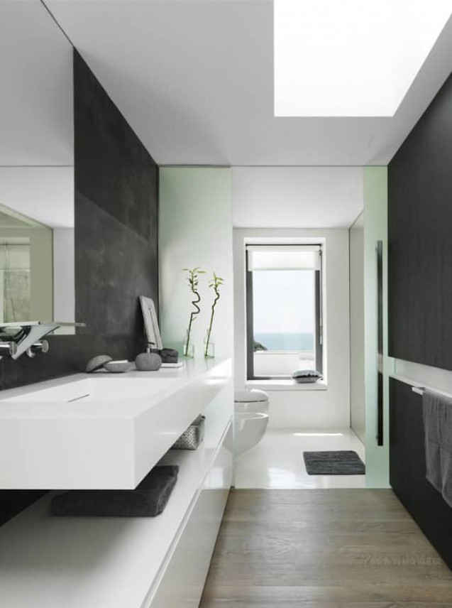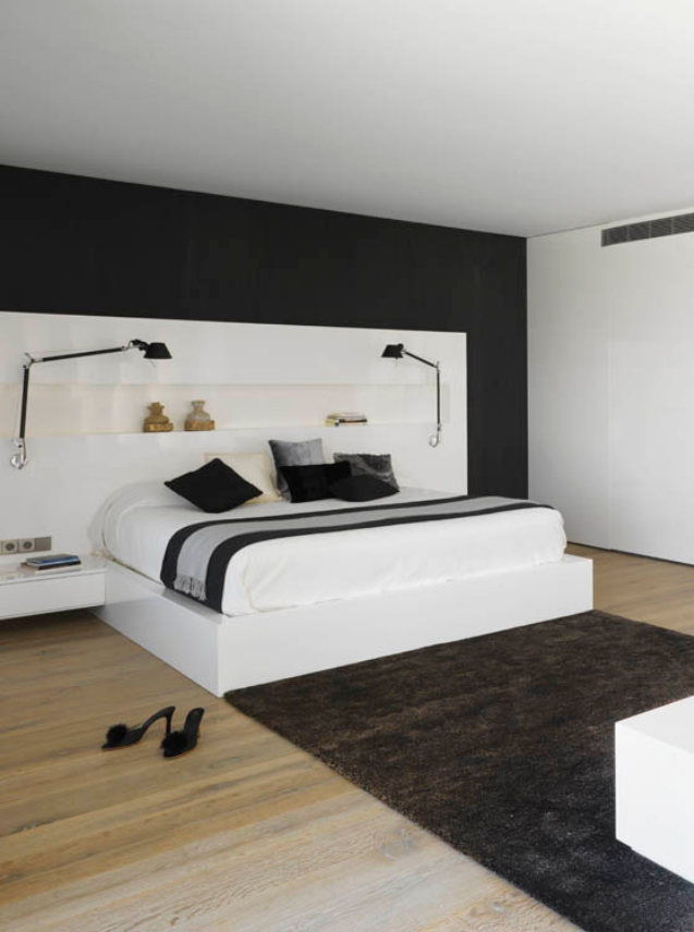 The upper part of the building houses a cube that locates the main suite. The room is decorated totally in white except for the bathroom, which is designed in deep dark basalt stone, and a black carpet that crosses the room. Several objects in distressed silver such as a mannequin and decorative frames on top of the boudoir also provide minimal touches of colour to the space.