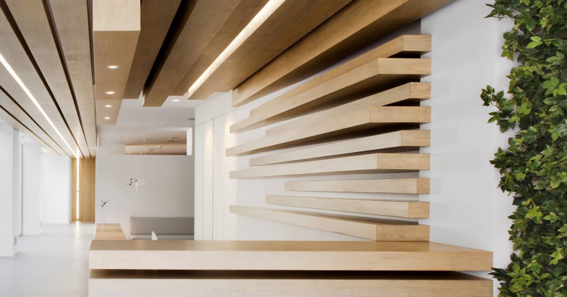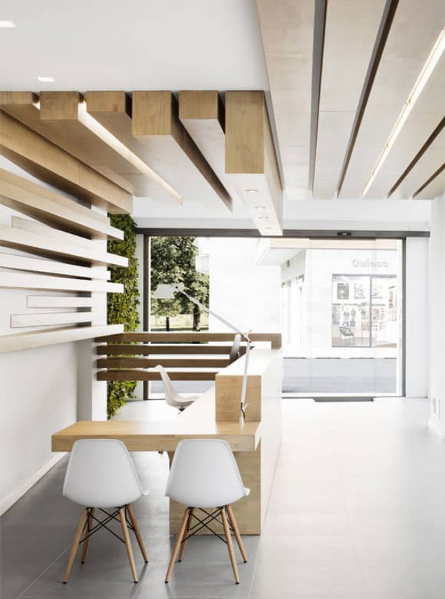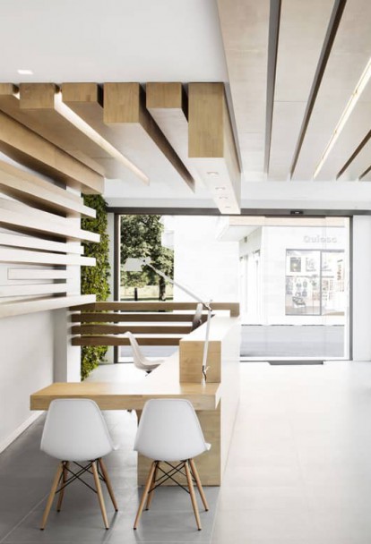 Interior designer Susanna Cots has been able to create an atmosphere of calm in a dental clinic by projecting a space in which the volumes, the sturdiness of solid wood and the unexpected presence of Nature in the form of vertical gardens, welcome patients to a world far from the traditional dentist.