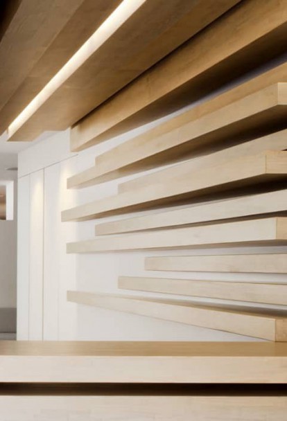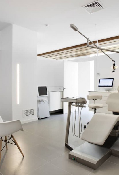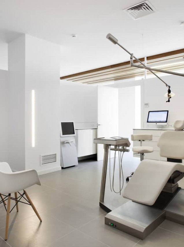 The reception area catches the eye with its combination of asymmetric, 15-metre-long wooden volumes that represent an irregular set of teeth. Just like a sculpture located on the ceiling, this central volume distributes the space towards the consulting rooms.