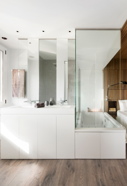 The suite includes a water area to evoke a relaxed feeling. This is why we have designed a bath next to the bed, with a door system that turns into a relaxing bench.