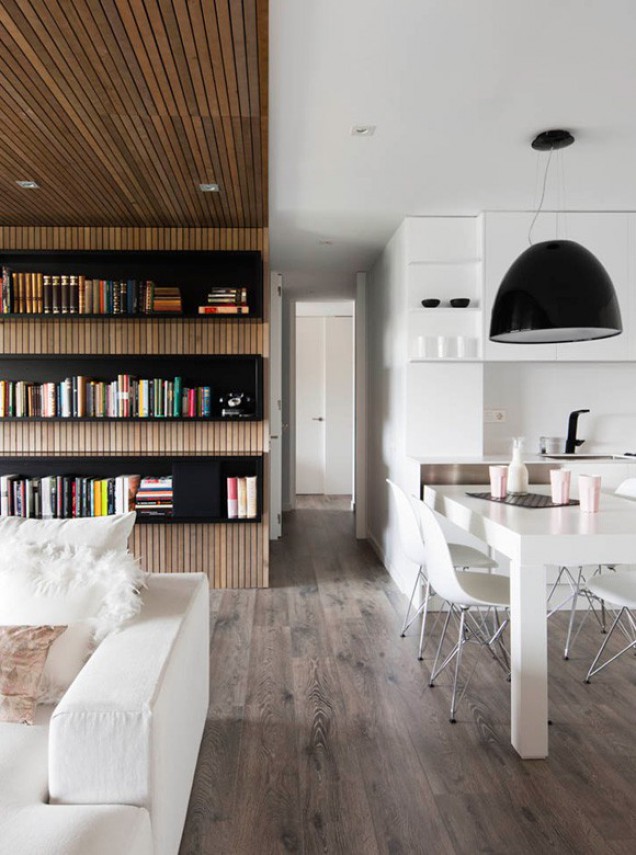 A powerful core that unites the visual and emotional dimensions of a space that combines white with timber