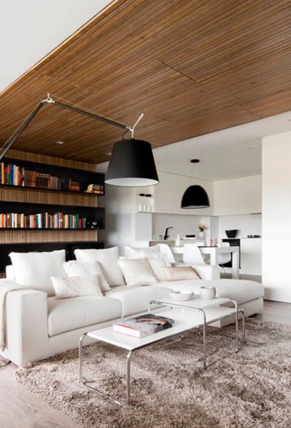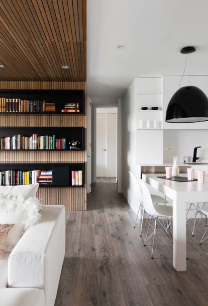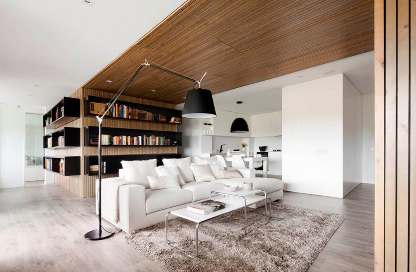 The starting point of the housing is located in its central nucleus where the dining room’s ceilings are dressed in wood that, at the same time, shapes the furniture that holds the TV and a bioethanol fireplace.