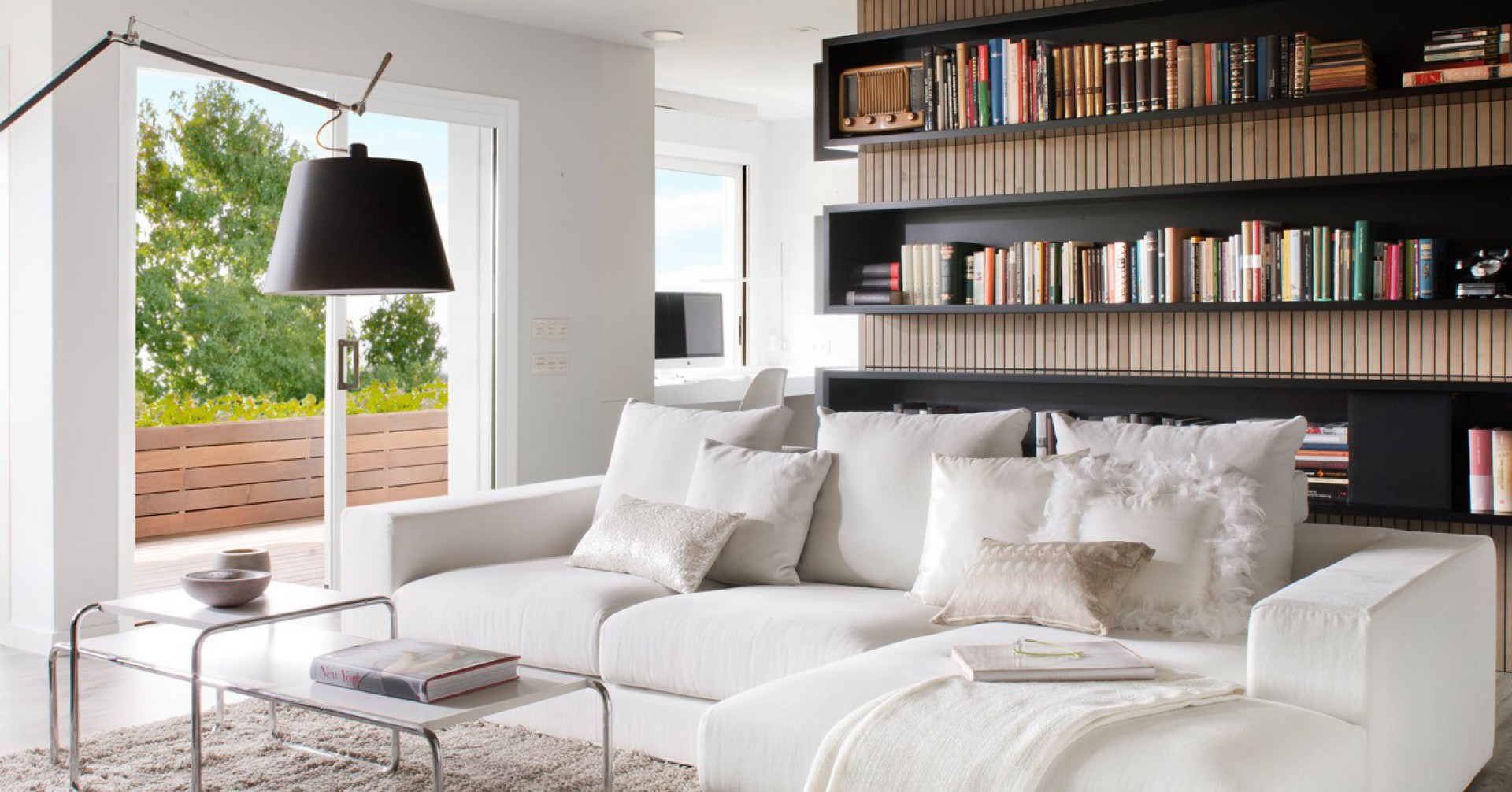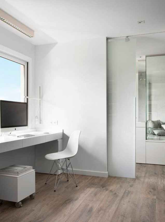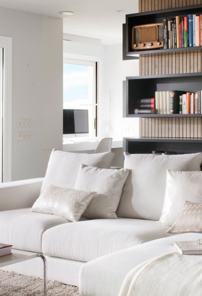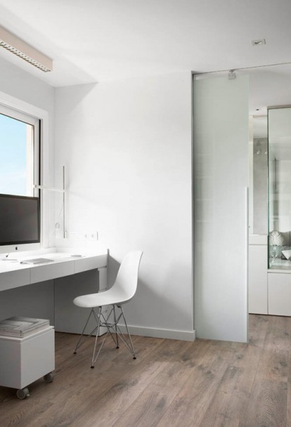 Reading is part of the daily routine of the owners and that is why the central area is transversally surrounded by bookshelves. The studio is fully integrated into the living room and creates a corner flooded in light that faces the terrace.