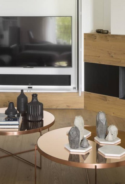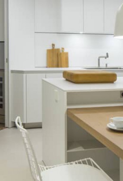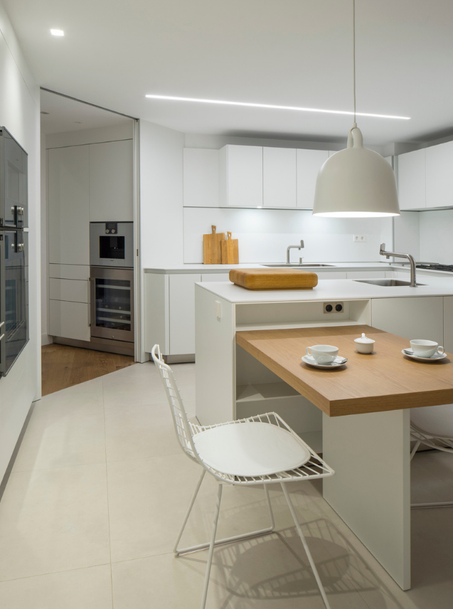 One of the most unique areas of this development is found along the passage, where timber-lined panels with white enamel paintwork recover the essence of the panels with mouldings from the 1950s in a contemporary interpretation.